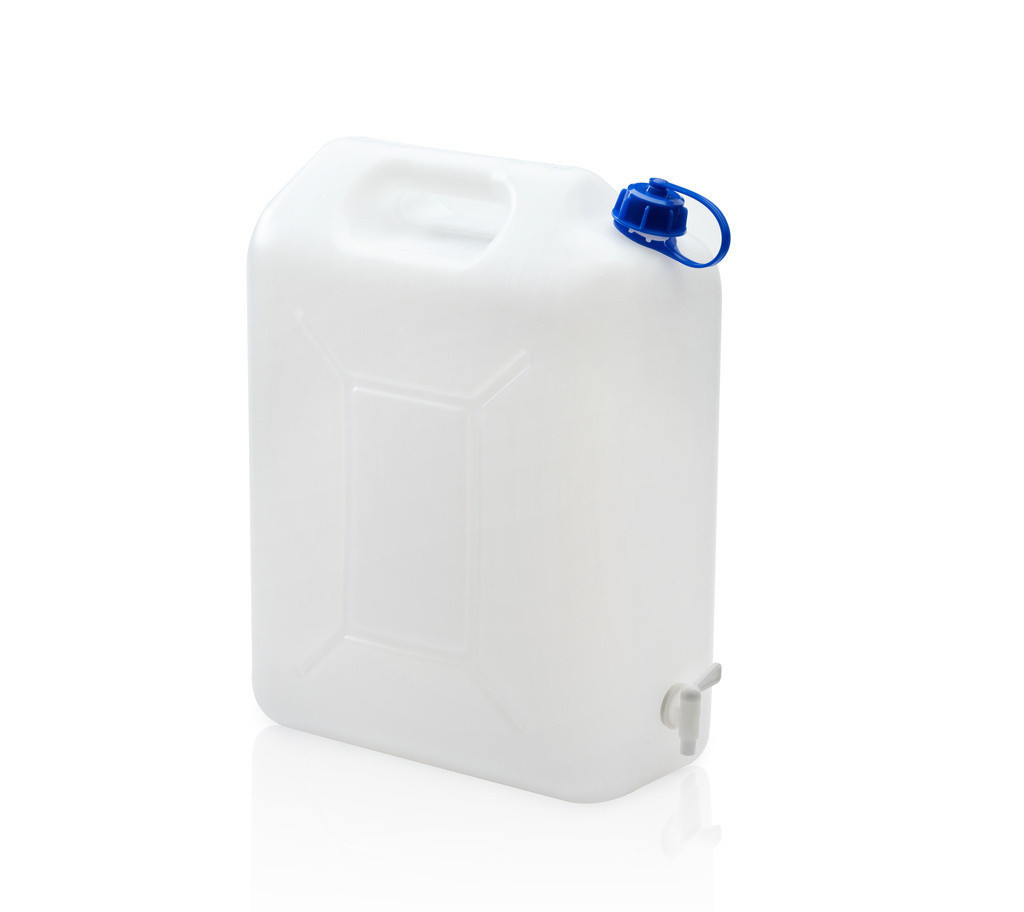 Műanyag kanna csappal, 20 literes űrtartalommal. A kanna élelmiszeripari tanúsítvánnyal rendelkezik, így alkalmas ivóvíz és egyéb élelmiszeriparban használt folyadékok szállítására.